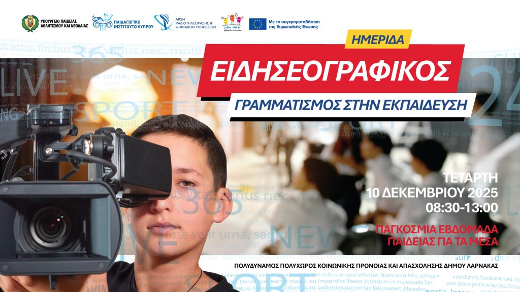 Το Παιδαγωγικό Ινστιτούτο Κύπρου (ΠΙΚ) σε συνεργασία με την Αρχή Ραδιοτηλεόρασης και Ψηφιακών Υπηρεσιών διοργανώνουν Ημερίδα με θέμα «Ειδησεογραφικός Γραμματισμός στην Εκπαίδευση», στο πλαίσιο της Παγκόσμιας Εβδομάδας της Παιδείας για τα Μέσα. Η Ημερίδα θα πραγματοποιηθεί την Τετάρτη, 10 Δεκεμβρίου 2025, στον Πολυχώρο του Δήμου Λάρνακας, από τις 08:30 μέχρι τις 13:00.